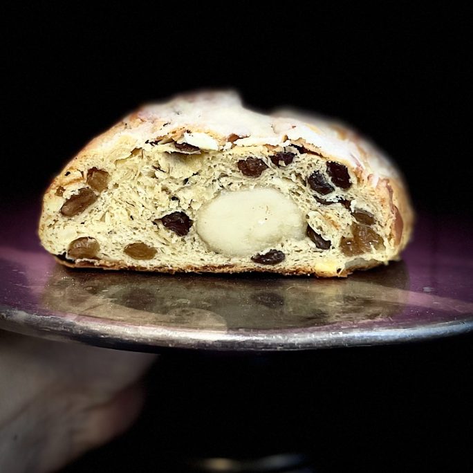 Naturally fermented, candied orange, dried fruit, honey, free range eggs, real butter, almond glaze.
